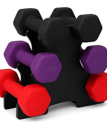 SUPORTE ORGANIZADOR COMPACTO: Acompanha base triangular resistente que mantém os pesinhos organizados, economiza espaço em apartamentos e facilita o acesso rápido para sua rotina diária.